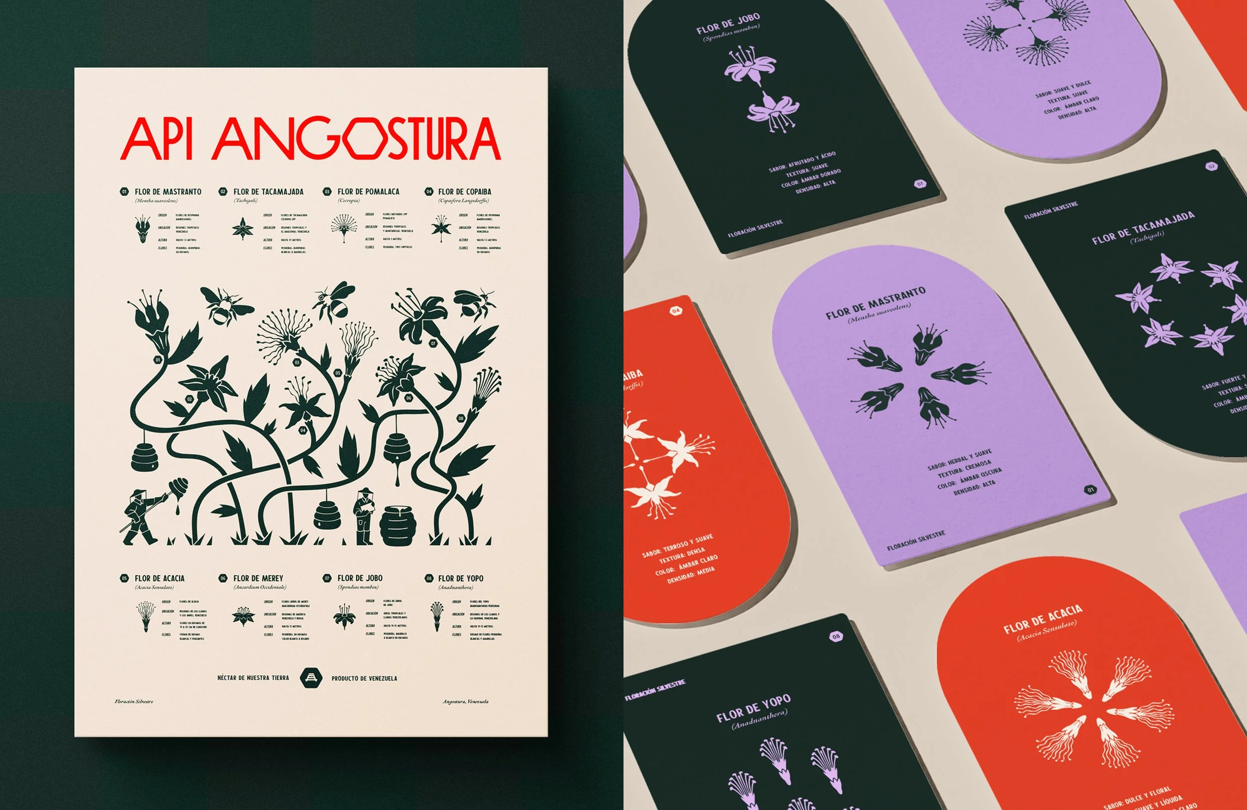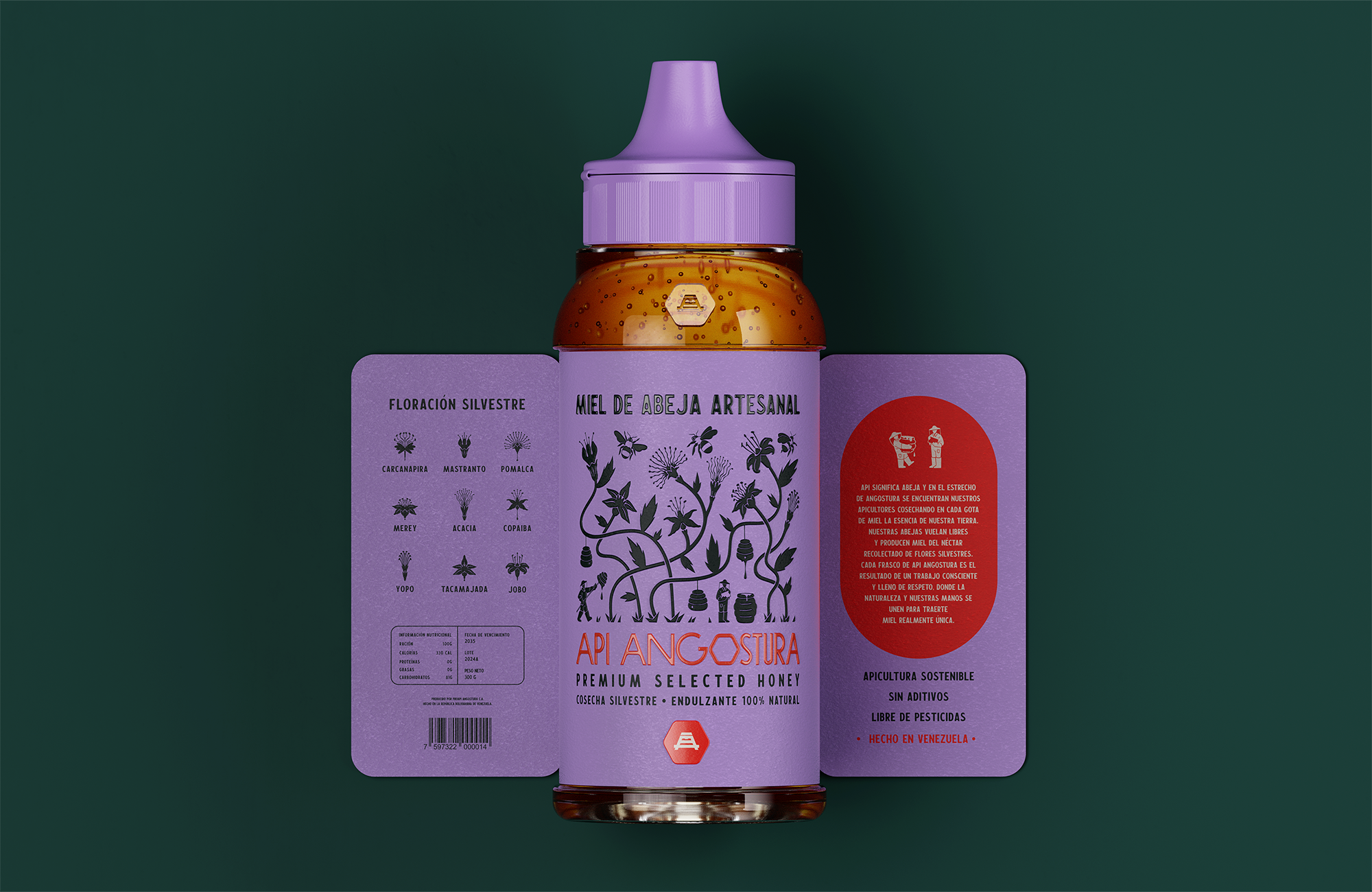 Api is an artisanal honey brand dedicated to preserving ancestral, sustainable harvesting practices. The design pays visual homage to the “nectar of our land.”, it draws inspiration from the magic of the jungle on the shores of the Strait of Angostura, where local wild flowering gives life to a truly unique honey. Through surreal illustrations, the scarcely documented endemic flowers of the region are rescued and placed at the heart of the visual narrative.
